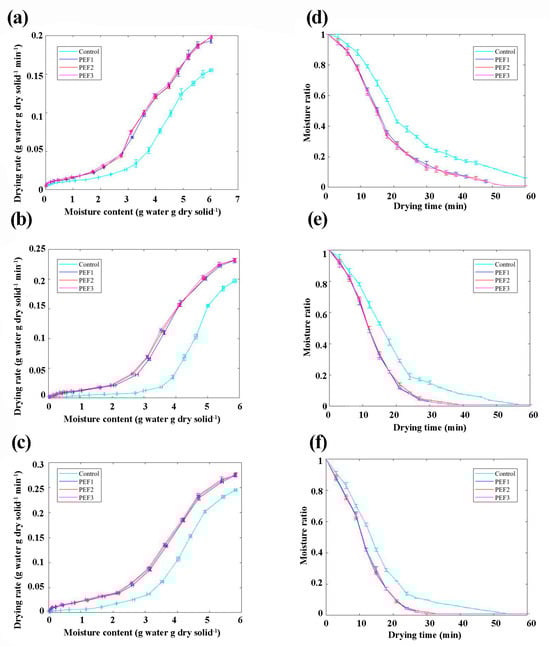 Drying rate curves for apple slices at (a) 100 W (b) 200 W and (c) 300 W. Moisture ratio curves for apple slices at (d) 100 W (e) 200 W and (f) 300 W. PEF1, PEF2 and PEF3 present the pulsed electric field under specific energy of 15.2, 21.07 and 26.8 kJ/kg, respectively.
