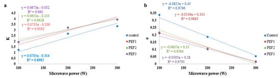 To assess the relationship between the kinetic parameter and microwave power, the kinetic constants were graphed against the power and a linear regression was computed (Figure 4). A linear correlation between the kinetic parameter and microwave power was observed. The linear regression models offer the potential to predict the drying rate at a power ranging from 100 to 300 W. The maximum calculated correlation coefficients by Page’s and Weibull’s models were 0.962 and 0.986, respectively. The pretreatments led to a more pronounced decrease in drying time at 300 W, whereas the escalation in the specific energy of PEF did not facilitate any further reduction. This pattern might be associated with the alteration of the initial water content due to pretreatments, which could potentially augment the mass transfer rate through the application of PEF.
