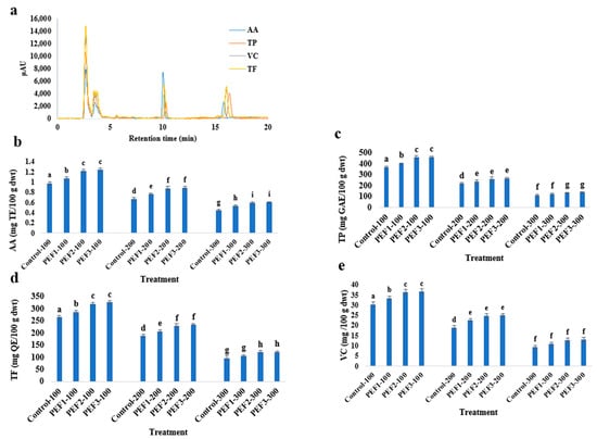 Effects of different energy microwave (a) and PEF treatment on (b) antioxidant activity (c) total phenolic content (d) total flavonoid and (e) vitamin C of dried apple slices. Different letters indicate significant differences between sample means (p < 0.05). (TP: phenolic content, TF: total flavonoid content, AA: antioxidant activity, and VC: vitamin C).