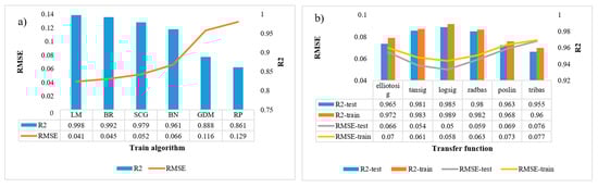 Afterward, the performance of different transfer functions was evaluated (Figure 6b). The Logsig function, with the corresponding train and test of correlation coefficient and root mean squared error with the neuron topology of 18–18 and epoch of 156 had the best performance. It was followed by tansig, radbas, elliotosig, poslin and tribas. It is noticeable that the transfer function of the first and second hidden layers was the same in Figure 5b. Thus, to achieve improved outcomes through distinct transfer functions for the first and second layers, the network was subjected to retraining using the Levenberg–Marquardt algorithm and the top 10 models are presented in Table 3.