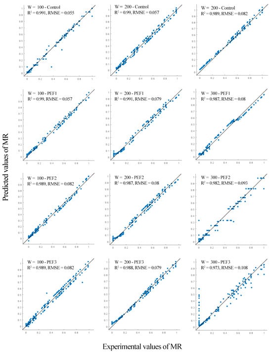 Figure 7 depicts the prediction models developed using the RBF network under various experimental conditions. The most optimal and least favorable outcomes were exhibited in the laboratory conditions of 200 W-control (R2 = 0.994, RMSE = 0.012) and 300 W-PEF3 (R2 = 0.847, RMSE = 0.127), respectively. Similar to the findings from mathematical and ANN modeling, the prediction accuracy was notably influenced by the quantity of microwave energy and the application of PEF treatment. The potential of SVR to predict the moisture ratio in the drying process has been confirmed by previous studies [,]. Ref. [] optimized the SVR model by investigating the Gaussian kernel regression parameters for the online prediction of the moisture ratio of lentil seeds in a microwave-fluidized bed dryer. Further, Ref. [] presented a novel modeling approach employing support vector regression methods enhanced by the dragonfly algorithm techniques to predict the drying kinetics of pea pods. They found that the optimized hyperparameters derived from the dragonfly algorithm effectively revealed the nonlinear characteristics of pea pod drying (R2 = 0.9983 and RMSE = 0.0132).