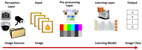 In Figure 5, the image came from image sources such as cameras, video clips, and datasets. The video clips were converted into frames of images, which were used as inputs in our model. Then, the pre-processing operations took effect on the images, as explained in Section 3.1.1. After that, each image was processed using a learning model to predict the final class. The classes were already mentioned in Table 2. The learning process could be divided into two approaches: single-level classification and two-level classification. In the learning phase of both approaches, a set of learning models known in the literature was employed to perform well during the classification tasks. Specifically, the experiments compared the following models’ performance: