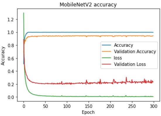 The accuracy score of MobileNetV2 in the five-way classification with up to 300 epochs.