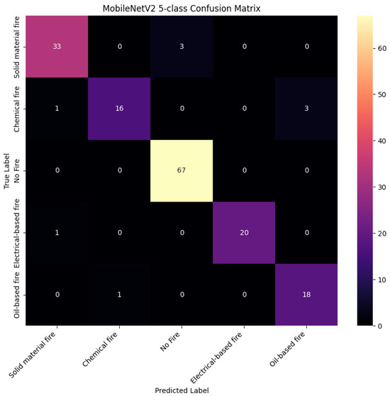 For the second classification level, the models were trained to perform a four-way classification task in order to distinguish between four different types of fire. Specifically, the models were required to identify the type of fire, whether solid-material, electrical, oil-based, or chemical. Table 6 shows the results for this set of experiments, wherein the models—once the presence of fire was determined—classified the type of fire, whether a solid-material, electric-based, oil-based, or chemical fire. The best performance was achieved using the EfficientNet-b0 model, which had an accuracy score of 97.55%. This was followed by the DenseNet121 model, which also had an accuracy score of 95.09%. The lowest performance in this task was attained using EffecientNetV2l, which had an accuracy score of 54.60%.