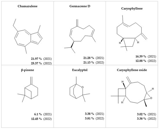 | Romania (western part) | chamazulene (38.89%) | germacrene D (12.90%) | β-caryophyllene (11.52%) | β-pinene (10.66%) | n.d.* | 0.47% | Jianu et al. | [45] |