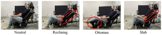 To investigate the effects of postural angles and tactile changes on physiological and psychological states, four types of seating conditions were established as experimental conditions: Neutral, Reclining, Ottoman (Reclining state with ottoman), and Slab (Neutral state with slab urethane), as shown in Figure 2. The seat used in this study was a standard car seat manufactured by Tachi-S Co., Ltd. (Tokyo, Japan). In the experiment, the Neutral state was defined as the default position of a typical car seat, with a torso angle set at 25°. The angle between the seat pan and the ground was approximately 10°. Utilizing the reclining function commonly found in car seats, we established the Reclining state, in which the torso angle was reclined by an additional 12° from the Neutral state, resulting in a torso angle of 37°. Additionally, assuming usage in the passenger seat rather than the driver’s seat, an ottoman (a footrest supporting the legs from the calves) was included as an experimental condition. For the Ottoman state, the knee joint angle was increased by approximately 45° compared to the position where the feet remain on the floor. This condition was designed to investigate changes in physiological and psychological states due to improved blood flow in the lower limbs and reduced peak seating pressure on the hips. Furthermore, to examine the response to changes in the softness of the backrest rather than changes in posture angles, we established the Slab state. In this condition, a slab of urethane material was placed over the backrest, aiming to increase the contact area and reduce peak pressure.