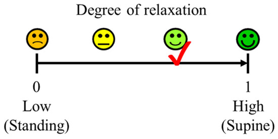 To assess the psychological state related to sitting comfort, participants were instructed to rate the level of relaxation for each condition using a visual analog scale, with the standing position designated as 0 and the supine position designated as 1. The participants were asked to mark their responses on the questionnaire sheet using the scale shown in Figure 4, after the physiological measurements.