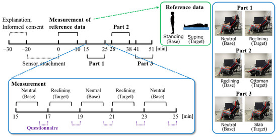 The experiment commenced after explaining the experiment’s details to the participants and obtaining their informed consent. Initially, physiological responses during the standing and supine positions were recorded three times to establish reference data. The duration of measurement in the standing and supine positions was 90 s each. To assess the impact of changes in seat parameters on physiological responses, the experimental procedure was divided into three parts: Neutral and Reclining (Part 1), Reclining and Reclining with Ottoman (Part 2), and Neutral and Slab (Part 3), with the base and target conditions set accordingly in each part. Physiological measurements were conducted for 90 s, followed by a subjective evaluation of the level of relaxation. The seat parameters were first set to the base condition, and then the conditions were alternated between the target and base conditions four times in each part. The experimental procedure is shown in Figure 5.