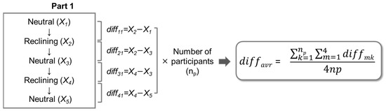 The results of differences in peak pressure of each section are shown in Figure 7. In Part 1 (Reclining-Neutral), a one-sample t-test revealed that the peak pressure on the middle and upper sections of the backrest was significantly decreased, while that on the lower section was significantly increased. The peak pressure on the middle and backward zones of the seat pan was significantly decreased due to reclining. In Part 2 (Ottoman-Reclining), the peak pressure on the lower and upper sections of the backrest was significantly decreased. The peak pressure on the forward zones of the seat pan was significantly decreased due to the ottoman. In Part 3 (Slab-Neutral), the peak pressure on the middle and upper sections of the backrest was significantly decreased. The peak pressure on the backward zone of the seat pan was significantly decreased due to the slab.