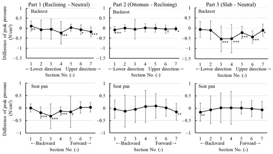 Differences in peak pressure of backrest and seat pan in each part. The upper graph represents the results for the backrest, while the lower graph represents those for the seat pan. Asterisks indicate significances: ✝, *, **, and *** for p < 0.10, 0.05, 0.01, and 0.001, respectively.