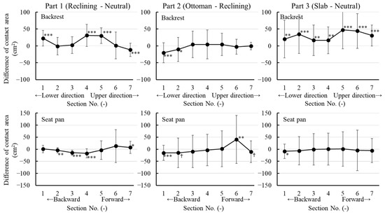 Differences in contact area of backrest and seat pan in each part. The upper graph represents the results for the backrest, while the lower graph represents those for the seat pan. Asterisks indicate significances: ✝, *, **, and *** for p < 0.10, 0.05, 0.01, and 0.001, respectively.