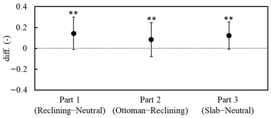 After calculating the VAS values for each trial from the questionnaire results, the average of the differences when changing the conditions was calculated. The results of differences in the subjective evaluation value for relaxation are shown in Figure 9. A one-sample t-test revealed that the relaxation value in the target conditions (Reclining, Ottoman, and Slab) was significantly higher than that in the base conditions in all parts (p < 0.01).