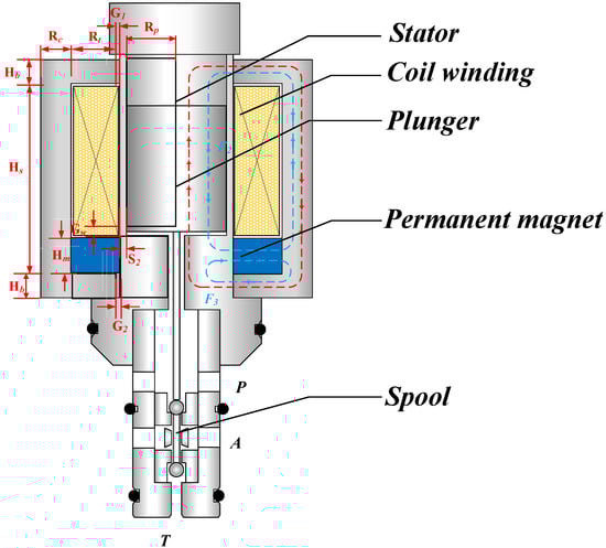 Figure 1 illustrates the structure of the new HSV. At the bottom of the solenoid coil, there is a radially magnetized permanent magnet ring structure. By producing a permanent magnetic field in the reverse direction of the excitation coil at the contact iron, the permanent magnet reduces the magnetic induction intensity throughout the magnetic circuit and prevents magnetic saturation. Furthermore, the use of a low magnetoresistive material with slightly lower saturation magnetic induction and high resistivity for the core, as well as the selection of a low magnetic resistance material for the contact iron, helps minimize eddy current losses. The introduction of the permanent magnet not only reduces the eddy current losses of the contact iron but also enhances the responsiveness of the electromagnetic coil.