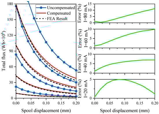 Based on the calculated flux at the equivalent air gap, considering errors due to the armature’s geometric shape, core saturation, and leakage flux, the correction factor C (i, z) is calibrated using finite element analysis (FEA) results. Figure 2 compares the FEA results with the electromagnetic force model, showing that the model is accurate after calibration.