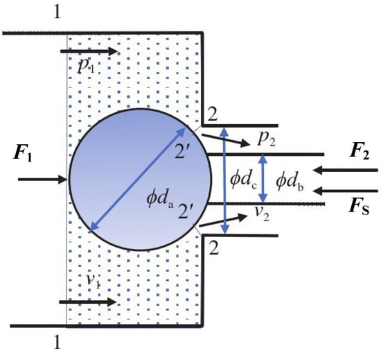 A model for the static hydrodynamic force acting on the valve core is established. Static hydrodynamic force refers to the force generated by the change in fluid velocity when the flow area and direction through the valve opening change, causing a change in fluid momentum. The control body, as shown in Figure 4, has a valve ball diameter of da, an intermediate pin diameter of db, and an aperture diameter of dc at the intermediate pin location. p1 is the inlet pressure, and p2 is the pressure behind the valve.