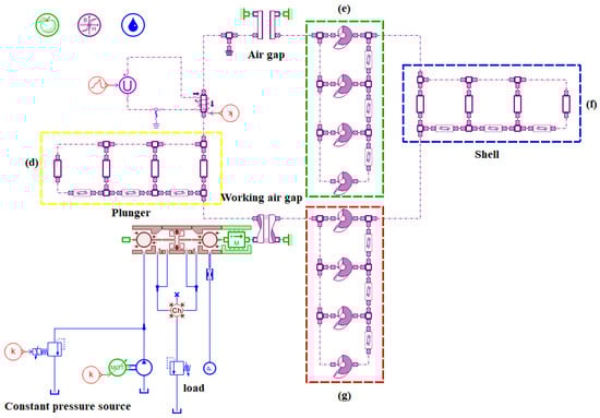 For the purpose of simplifying calculations, the dynamic simulation model of the HSV system shown in Figure 5 disregards the impact of coil temperature rise and hydraulic oil temperature during operation. The model encompasses three main systems: magnetic circuit, hydraulic, and mechanical components within the HSV. To establish a more accurate magnetic circuit model, the circuit is divided into four parts based on the simplified system model diagram, with further subdivisions based on the magnetic field distribution. The regions denoted by (d–g) in Figure 5 correspond to the respective labeled regions in Figure 6. DT4 is employed as the magnetic circuit material, and the magnetic resistances of each part can be derived from the B–H curve of the material. To emulate the real operational environment of the HSV, a quantitative pump is utilized as the fluid supply source, operating at a rotational speed of 1500 rev/min. The load is represented by a constant pressure source and an overflow valve, replicating the pressure conditions at ports A and T of the HSV during the hydraulic cylinder’s extension and retraction. The mechanical components primarily comprise the moving parts of the HSV, facilitating the simulation of valve core displacement, force status, and mass. The coupling of these three systems yields the dynamic model of the HSV.