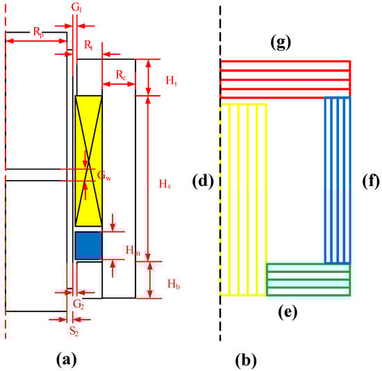 As shown in Figure 6, where Rp is the diameter of the armature, Rt is the width of the magnetic guide ring, Rc is the thickness of the outer shell, Ht and Hb are the thickness of the upper and lower magnetic guide rings, Hs is the height of the outer shell, G1, and G2 are the thickness of the upper and lower nonworking air gaps, and Gw is the thickness of the working air gap. S1 is the thickness of the pressure-resistant shell. Simulations can be performed by assigning various values to each design parameter in Figure 6a, thereby obtaining the corresponding system flow output and the currents in the coil winding. The range of values for the design parameters is presented in Table 1.