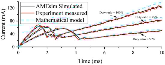 To validate the dynamic simulation model, experimental tests were performed on the valve model using the REXROTH 7920 (Bosch Rexroth, Lohr am Main, Germany). Under a 12 V power supply, the HSV valve core was actuated from the minimum to the maximum opening using three distinct duty cycle driving signals. Figure 6 illustrates the coil current measured during this process. The valve model’s simulation provides the same three distinct duty cycle driving signals, with the simulated coil current depicted in Figure 7. Due to the coil’s inductance, the current gradually increases and then stabilizes, influenced by the back electromotive force generated by the armature’s movement. When the armature contacts the valve seat, the back electromotive force diminishes, causing the coil current to continue rising rapidly. As the armature’s total displacement and mass are measured values, if the model’s coil current matches the experimental results, it demonstrates the accuracy of the modeling for inductance, back electromotive force, and valve dynamics. Figure 6 demonstrates that the current profiles for both the modeled and actual valves are essentially identical across all three duty cycles, highlighting the model’s high precision at various valve core positions. It is worth noting that in the 100% duty cycle curve after 5 ms, the measured and modeled values are different but remain unchanged. This is due to the limitation of the sensor range; according to the trend of past data, the current in the actual coil continues to increase.