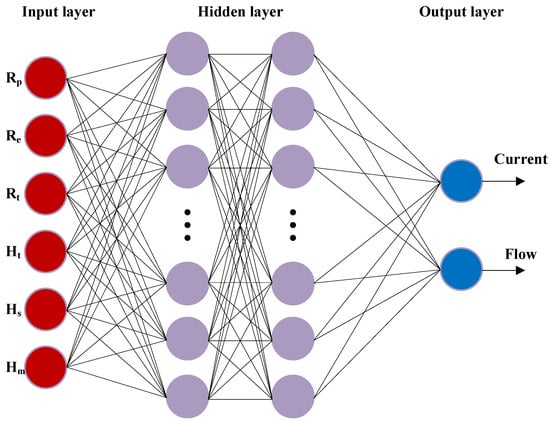 The BPNN structure consists of an input layer, hidden layers, and an output layer, as illustrated in Figure 8. The input layer is composed of six neurons, corresponding to the six input structural parameters. In the output layer, there are two neurons representing the system’s output flow and the current in the winding. The hidden layers are positioned between the input and output layers. To strike a balance between training accuracy and avoiding overfitting, two hidden layers are employed. The determination of the number of neurons in the hidden layers does not have a precise formula and is often achieved using the empirical Formula (10). In the formula, H denotes the number of neurons in the hidden layers, I signifies the number of neurons in the input layer, O represents the number of neurons in the output layer, and α is a constant between 1 and 10. Activation functions are utilized to establish connections between layers, which introduce non-linear factors and augment the expressive capability of the neural network.