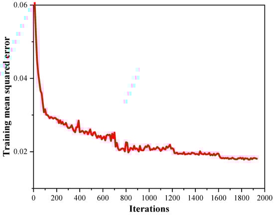The main characteristic of BPNN is its ability to propagate signals in a forward direction and errors in a backward direction. It is a supervised learning method that relies on a training sample set with known target outputs. In the training process, the network’s weights and thresholds are initially set to random values. The signal first enters the input layer, followed by the hidden layer, and finally reaches the output layer. If the predicted values from the output layer do not match the expected outputs, error propagation occurs. The weights and thresholds of the neural network are adjusted layer by layer using the gradient descent method. As depicted in Figure 9, this adjustment process is iterative, continuing until the network’s predicted values approximate the target values and the error no longer decreases, signifying the completion of network training. Mean square error (MSE) is the most commonly used error in regression loss functions. It is the sum of the squares of the difference between the predicted value and the target value, and its formula is as follows: