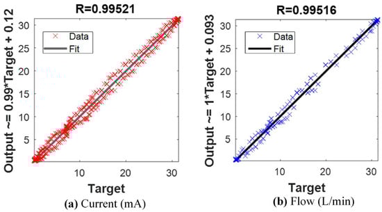 A total of 2100 samples were selected as the training set, while 900 samples were designated for the purpose of testing the BPNN model. Figure 11 provides a visual representation of the fitting between predicted values and target values, accompanied by their respective R2 values. It is evident from the figure that the BPNN model exhibits a strong linear fit for both the current (a) and flow (b) tests, with R2 values approaching 1. Based on the analysis conducted, it can be concluded that the established BPNN model demonstrates a notable level of prediction accuracy, effectively capturing the nonlinear relationship between the structural parameters and performance of the HSV.