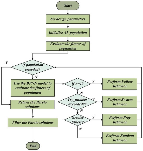 Among the numerous metaheuristic algorithms, the artificial fish swarm algorithm (AFSA) has recently garnered significant attention in the literature []. The AFSA is a population-based intelligent optimization algorithm, fundamentally inspired by the follow, swarm, prey, and random behaviors of fish [,,]. This algorithm is applicable to various continuous and combinatorial optimization problems. Suppose an artificial fish is currently in state Z, with a visual field set to V, and at a given moment, its viewed position is Zv. If the state at the viewed position is better than the current state of the artificial fish, the fish can move one step towards Zn; otherwise, it continues to search within its visual field for other positions. The perception ability of artificial fish to the surrounding environment increases with the number of explorations, and the improvement of perception ability can help AF make the next decision.