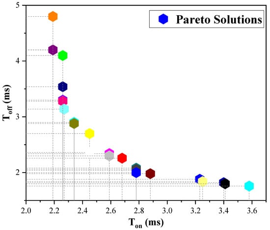 Optimization design was conducted employing a multi-objective optimization algorithm. The individual characteristics were determined based on the structural parameters of the driving solenoid coil, and the population was initialized accordingly. Fifty randomly distributed individuals were generated within the predefined range as outlined in Table 1. The objective functions selected for this study were the opening and closing times, wherein the output flow was assessed using the established BPNN model. The opening and closing times were determined based on the valve’s output flow, with full valve opening considered achieved when the flow reached within 5% of its maximum value. The ultimate goal of the optimization process was to minimize both objective functions to the greatest extent feasible. Following the process depicted in Figure 12, iterative calculations were performed with a maximum of 200 iterations. Subsequently, all non-dominated solutions generated throughout the iterations were preserved, while duplicate non-dominated solutions were eliminated. The resulting Pareto front was visualized as a two-dimensional scatter plot. Figure 12 displays the final Pareto optimal set, consisting of 30 solutions, showcasing the opening and closing times for HSV. Each data point represents a distinct configuration of electromagnetic solenoid coil parameters, and no particular parameter configuration demonstrates superiority over others in terms of HSV’s dynamic performance. Hence, these solutions are deemed optimal.