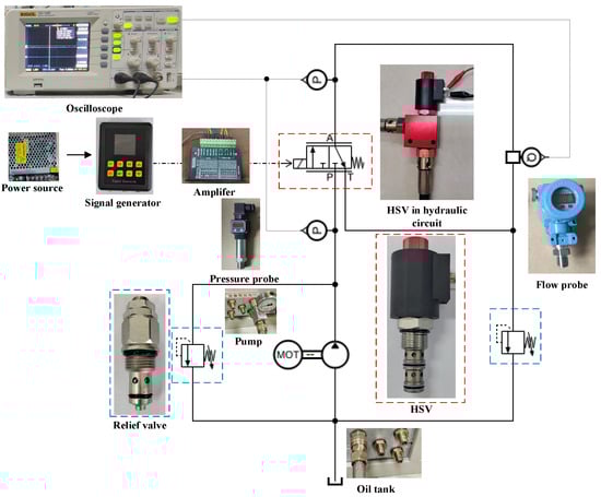 To validate the performance of the proposed HSV, a prototype was fabricated based on the computation results obtained from the AFSA algorithm. The prototype, denoted as HSV, is illustrated in Figure 13. As it is not feasible to directly measure the valve core opening, its movement can be observed by monitoring the input current to the solenoid coil and the flow rate. A test setup, as depicted in Figure 14, was devised specifically for this purpose. Since the flow channels from port P to port A and from port T to port A in the HSV are identical, it sufficed to test only one of them. The hydraulic pump was configured to generate an output pressure of 14 MPa, and this pressurized fluid was directed through the HSV before being measured by a flow meter. The flow meter provided a signal that was recorded by a data acquisition device, while the flowing hydraulic fluid subsequently entered the relief valve, which served to simulate the load. Following the relief valve, the fluid was channeled into the oil tank. The HSV was actuated by a step signal produced by a signal generator, with the current output from the flow transmitter and the pressure transmitter being captured by an oscilloscope. A step signal, lasting 50 ms and possessing a voltage of 12 V, was applied as an input to the HSV system, with the resulting current and flow data being recorded. Table 2 shows the model and parameters of the equipment used in the experiment, while Table 3 displays the initial and optimized dimensions of the valve.