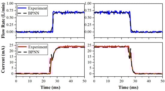 The black dashed line in Figure 15 represents the BPNN’s fitted output for the design parameter. By examining the flow output curve of the HSV, it becomes evident that, apart from a significant deviation at the initial movement of the valve and around its maximum opening, the predicted flow output and opening time of the HSV closely align with the experimental results. An analysis of the predicted current variation in the solenoid coil indicated that the BPNN exhibits some error in predicting the armature movement and the maintenance current; however, the overall trend remains consistent. In conclusion, the BPNN, trained using the system dynamics simulation model, demonstrates a substantial capability to accurately predict the system output.