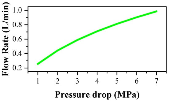 Valves in hydraulic systems introduce resistance to the passage of fluid. This resistance grows as the flow rate increases. Consequently, the flow–pressure curve, also referred to as the P–Q curve, holds significant importance in fluid systems. By conducting experiments to adjust the output flow rate of the quantitative pump and analyzing the pressure data both upstream and downstream of the HSV, it is possible to construct the flow–pressure drop curve for the HSV (Figure 16). It is evident that as the pressure drop rises, the output flow rate of the HSV steadily increases, peaking at a pressure drop of 7 MPa, approximately equal to 1 L/min.