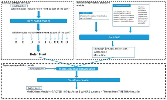 Our proposed model includes three modules: “Key value extraction”, “Relation and properties prediction”, and “Cypher query prediction” (Figure 3).