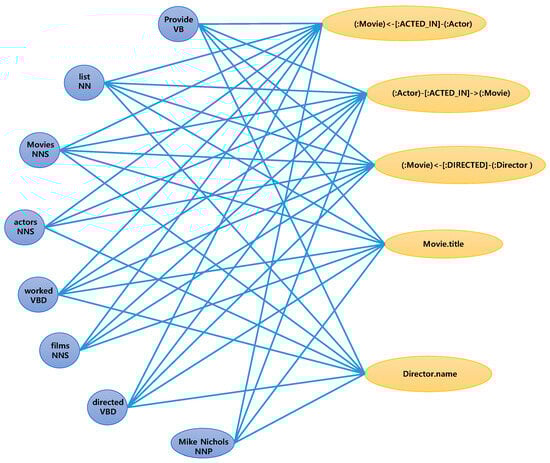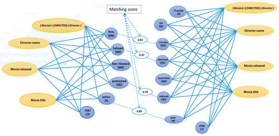 Connections are established between each term node in T from qn and corresponding relation–property node in P from cn. After that, a comprehensive representation of the relationships between the question and the schema is established. The question–schema relationship graph building example is also described in Figure 6.
