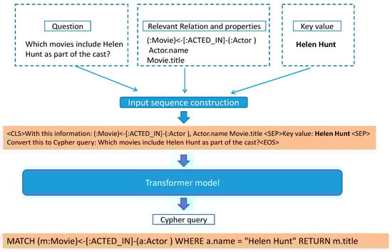 To guide the Cypher prediction module in identifying the information and question components, we defined three sequence guidelines: D1, D2, and D3. The guideline is a defined sequence, which helps the model better understand which information is addressed after. Specifically, D1, D2, and D3 guideline was used for relation–properties features, key-value features, and the question, respectively. Therefore, the relation–properties features follow the D1 guideline, the key-value feature follows D2, and the question follows D3. To make the input sequence for the Cypher prediction module, firstly, a special token [CLS] is inserted at the beginning to signal the start of the information. Next, the D1 guideline is added, followed by the relation–properties information. After that, the pairs key value guideline (D2, K) and question guideline (D3, Q) are also included in the sequence. We separated those pairs by adding [SEP] token between them. At the end of the sequence, an <EOS> token is added to indicate the end of the information. In our experiment, we defined D1 = “With this information”, D2 = “Key value:”, and D3 = “Convert this to Cypher query:”. The detail input is illustrated in Figure 8.