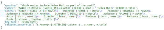 To create the text-to-Cypher dataset, we first compiled a list of template questions that inquire about the information contained in the database. These template questions are structured as follows: “What movies feature the performance of [actor]?”, “Can you provide a list of movies in which both [actor1] and [actor2] appear?”, and so on.