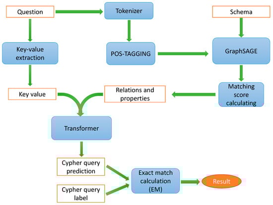 With the exponential growth of digital data, social networks, and the Internet of Things (IoT), many databases have been introduced to meet the demand for handling vast amounts of data in industry and academia []. Among them, Neo4j is a promising database like the trendiest product []. In Neo4j, the query language Cypher (QLC) is recommended as the optimal language to access the database []. However, the syntax and operations of Cypher are complex and require a considerable learning curve for users. Thus, question-to-Cypher query research aims to enhance accessibility by allowing nontechnical users to interact with graph databases using natural language, making data retrieval more intuitive and user-friendly.
