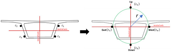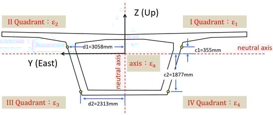 Figure 2 is a cross-section of the box girder, and it is divided into four dimensions regarding the y and z axes. There are four fibers parallelly installed on the box girder in the x direction of each dimension. Each of the fibers outputs a set of strain data. The strain values of each fiber are defined as ε1, ε2, ε3, and ε4. The vertical distance to the geometric center is c1, c2. The horizontal distance to the geometric center is d1, d2. The distance between the fiber and the geometric center is shown in Figure 2.