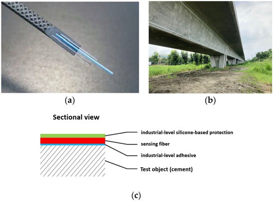 The fiber cables used in this research are single-mode optical fiber with four cables running parallel to each other on the box girder bridge. The working temperature ranges from −20 °C to 80 °C. The optimal strain-sensing range of the fiber cable used in this research is set at 5000 με. To account for the expansion of the bridge structure, fiber cables that have steel wires embedded are chosen for testing in this research, as shown in Figure 6a. Steel wires in fiber cable greatly improve its tensile strength, and the maximum tensile strength for this fiber is 15 kg-f.