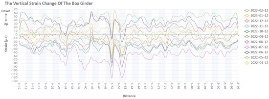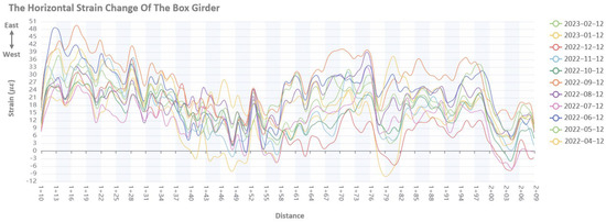 For this research, data were collected on the 12th of every month. For a single fiber, the length between data points was 5 cm and the length of the bridge span was 27.1 m, which equals 27.1 m/0.05 m = 542 data points for each span. There were a total of 33 bridge spans for this research, which amounts to 542 × 33 = 17,886 data points. Distance in this research are presented as n + m. The “n” stands for the serial number of the box girder, and “m” stands for distance in meters. The starting points of the box girder were at a distance of 30 m apart from each other. The period of measurement was from 12 April 2022 to 12 February 2023. Figure 8 shows the horizontal strain changes throughout the year. The horizontal strain change was obtained by subtracting the initial horizontal strain value from the measured horizontal strain of the DFOS data. The strain values were also processed through data smoothing. During the period of observation, the horizontal strain change was between 50 με and −10 με.