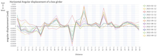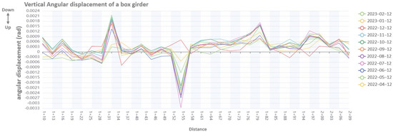 Figure 14 shows the vertical angular displacement of the expansion joints at each measurement location. Positive angular displacement means that the box girder is curving downward. The angular displacement on 1 + 31 is curving downward, and on 1 + 55, it is curving upward. The magnitude of the angular displacement also increases throughout the year.