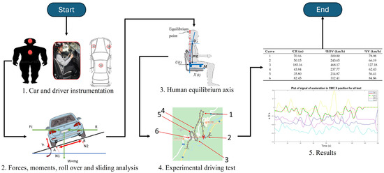 The experimental test integrates some characteristics that are necessary for each process. The experiment was carried out under a controlled environment, and the test subject’s safeguard was primary. The test was developed in a current commercial model vehicle on a curvy Japanese highway. At all times, the host country’s current traffic regulations, such as speed limits and signs, must be respected. The test subject must have a driving license and be a person who usually drives, not a professional or highly experienced driver. The D.A.D. did not alter the driver’s usual environment; in this instance, no significant modifications were made to the car. Further, objects should not be placed on the driver’s body, which could significantly impair its performance. In a general way, Figure 1 describes each process involved in a flowchart diagram.