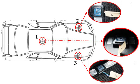 Car instrumentation: (1) accelerometer location on center of mass, and (2), (3) front wheels from car. Sensors are strategically positioned to measure values in the data acquisition system.