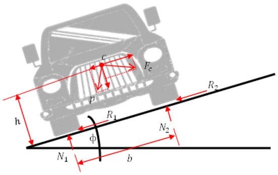 According to the forces shown in Figure 5, supposing a two-dimensional analysis, the weight of the car is divided equitably on the wheels (W [W1, W2]). Thus, the same happens with the normal forces (N [N1, N2]) and frictional force (R [R1, R2]). Notwithstanding, centrifugal force is kept in the center of the car’s mass (Fc). After Figure 6, several mathematical analyses can be developed to understand the possible reason for rolling over a car. First, notice that to avoid rollover, the reactions (N1, N2) must be over zero, and the best stability is when N1 = N2. On the other hand, rollover is going to happen when one reaction force turn equals zero, and then the other one holds the total weight of the car. To better understand this, momentum analysis is essential, and two momentums are responsible for car stability. The overturning momentum is the product of the centrifugal force (Fc) and the height of the car (h). The other one is known as the stabilizing momentum, which is the product of the reaction N2 (for this example, N1 = 0, N2 = W) and the half of the distance between the car’s wheel (d/2), Equation (1).