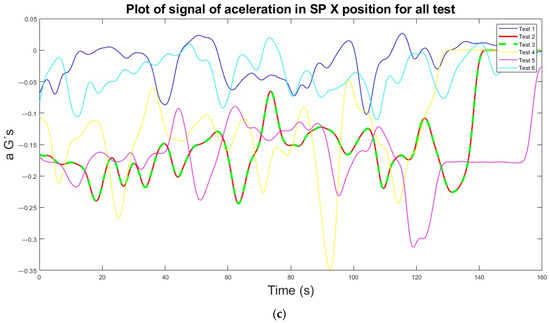 Graphic of accelerations in co-driver position in the X-axis: (a) center mass of car, (b) copilot position, and (c) driver position.