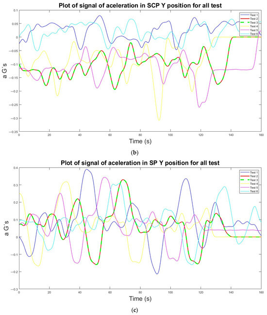 Graphic of accelerations in co-driver position for Y-axis: (a) center mass of car, (b) copilot position, and (c) driver position.