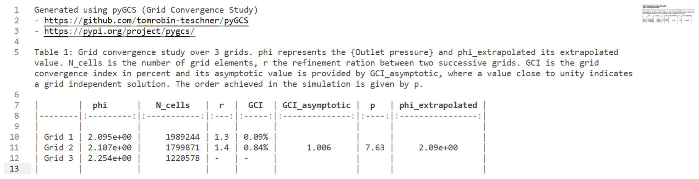 - Teschner, T.-R. Grid Convergence Study {pyGCS}. 2021, PyPI: pyGCS 0.2.0. Mar. 10, 2021, PyPI: pyGCS 0.2.0. Available online: https://pypi.org/project/pyGCS/0.2.0/ (accessed on 1 September 2024).