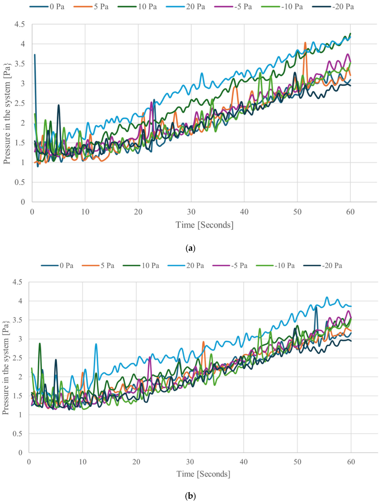 - Increasing the server fan head does not address the issue of hot air recirculation in the server, which aggravates the situation. The server inlet air temperature increased by an average of ~5% from −20 Pa to −5 Pa back pressure, and by 19% at the free delivery point (0 Pa). The inlet air temperature was further increased by 10% at back pressures of 5–20 Pa. The outlet air temperature decreased by 1%, signifying poor cooling effectiveness owing to high static pressure.