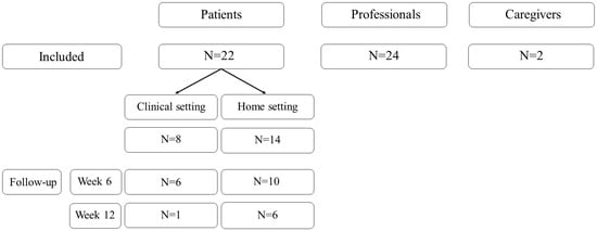 A total of 22 patients, 2 caregivers, and 24 professionals were included in the trial. The baseline characteristics are summarized in Table 2.