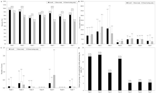Patient observation grid results. The success percentages (A); execution times in seconds (B); number of errors (C); and percentage of patients who needed help (D) for each task are depicted. Task 1: connect CogniViTra (turn on the box using the power button); Task 2: log in as a patient using the following data; Task 3: Read the welcome notes and click start; Task 4: start the exercise session and perform the dual-task training session; Task 5: pause the game, read the instructions for the exercise again, then resume and continue the exercise; Task 6: once you finish the programed session, consult the results; Task 7: exit the session by clicking on “Exit”.