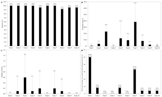Professional observation grid results. The success percentages (A); execution times in seconds (B); number of errors (C); and percentage of professionals who needed help (D) for each task are depicted. Task 1: Access Cognivitra; Task 2: Log in as a professional; Task 3: On the dashboard, open the “Add new patient” menu and create a new patient; Task 4: Save the data; Task 5: On the dashboard, open the “schedule session” icon and select “add”; Task 6: Choose the “advanced” schedule type and select 2 days of training per week; Task 7: Select the exercises to prescribe and the type of action needed; Task 8: Set the starting level and duration of each exercise; Task 9: Check the structure of the scheduled sessions and save the data; Task 10: Exit the session by clicking on “Exit”.