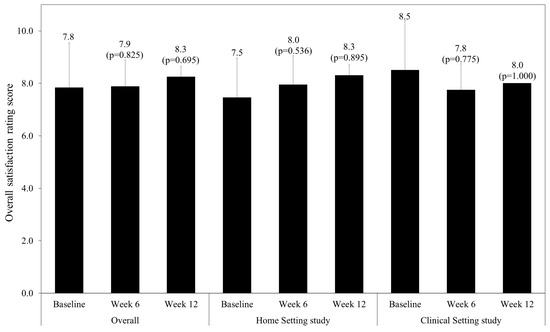 Among all participants, an overall satisfaction rating score of 7.8 ± 1.7 (out of ten) was obtained, which increased to 7.9 ± 1.0 and 8.3 ± 0.4 after 6 and 12 weeks, respectively. However, nonsignificant differences were observed during this period. In addition, while the mean values increased in the home study (from 7.5 ± 1.5 to 8.0 ± 1.1 and 8.3 ± 0.4), overall satisfaction among the participants in the clinical setting study decreased during the same time frame (from 8.5 ± 1.9 to 7.8 ± 1.0 and 8.0 ± 0.0; Figure 4).